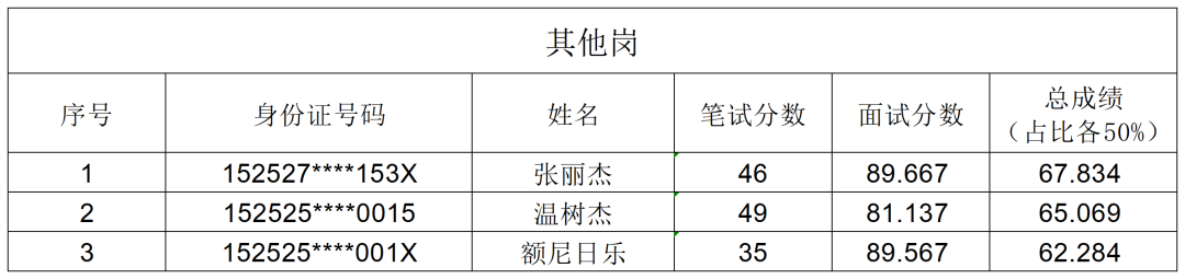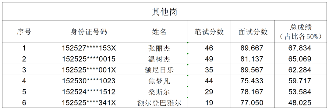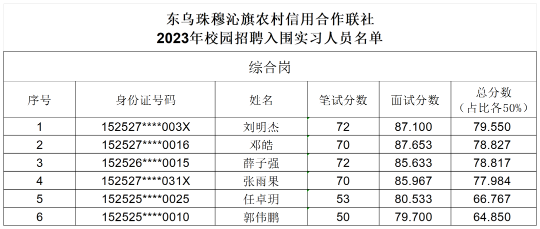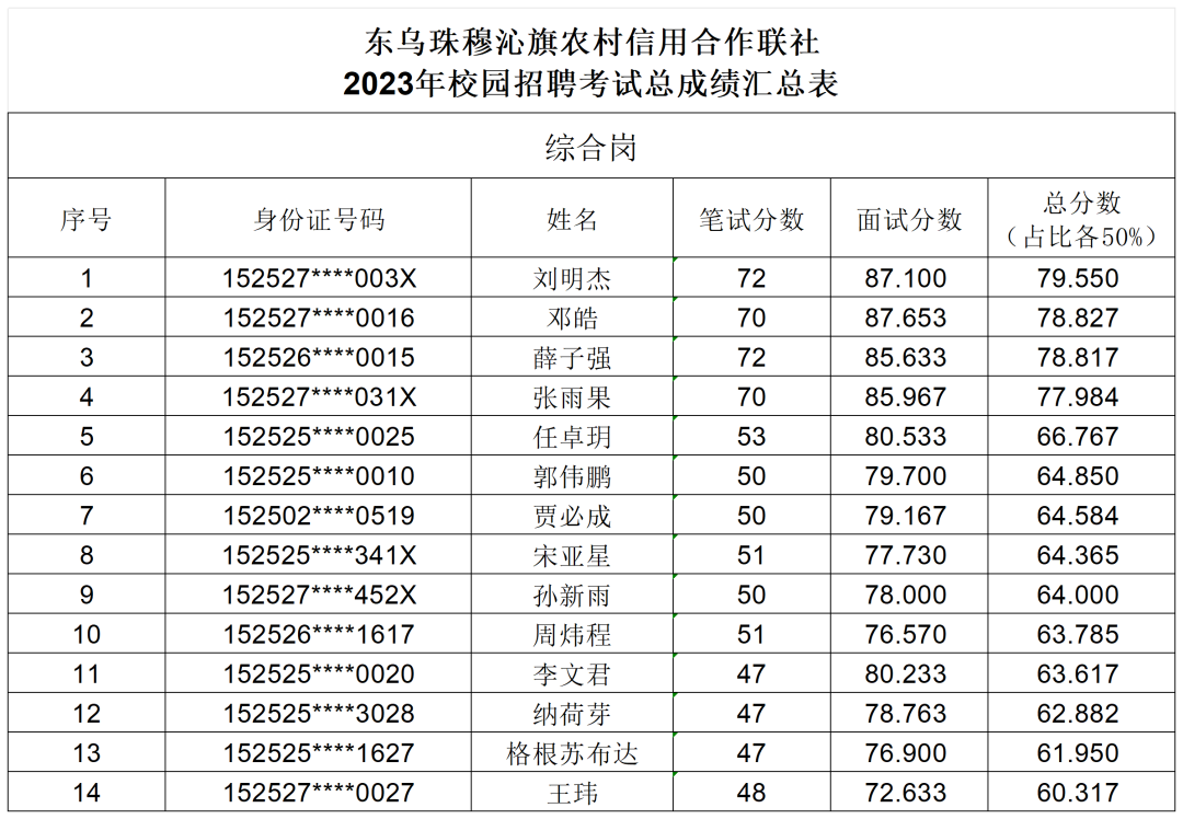 根據(jù)2023年校園招聘工作方案要求,考生參加筆試、面試兩輪考試,按照筆試與面試成績5 :5的比例加權(quán)計(jì)算總成績(考試總成績=筆試成績×50%+面試成績×50%),現(xiàn)將東烏珠穆沁旗農(nóng)村信用合作聯(lián)社2023年校園招聘考試總成績進(jìn)行公示。